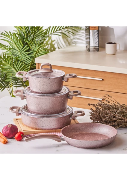 Golden pink ve gri renk seçenekleri mutfağınıza neşe ve renk katacak 7 parça Premium Granit set, 4 kat granit görünümlü kaplaması ile yanmaz yapışmaz özelliğine sahiptir.